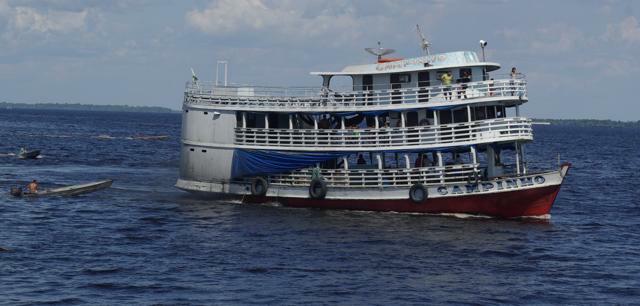 Die Fahrt auf dem Amazonas ist eine sehr ruhige Angelegenheit. Wir liegen in unseren Haengematten und schauen zu, wie der brasilianische Urwald an uns vorbei zieht. Das Ganze hat durchaus einen meditativen Charakter. Ab und zu legt das Schiff an einer Siedlung an, Waren und Passagiere gehen an und von Bord. Fliegende Haendler entern das Schiff und versuchen ihre Waren zu verkaufen, was wir gerne annehmen, da man fuer das Essen an Bord relativ ekelfest sein muss.