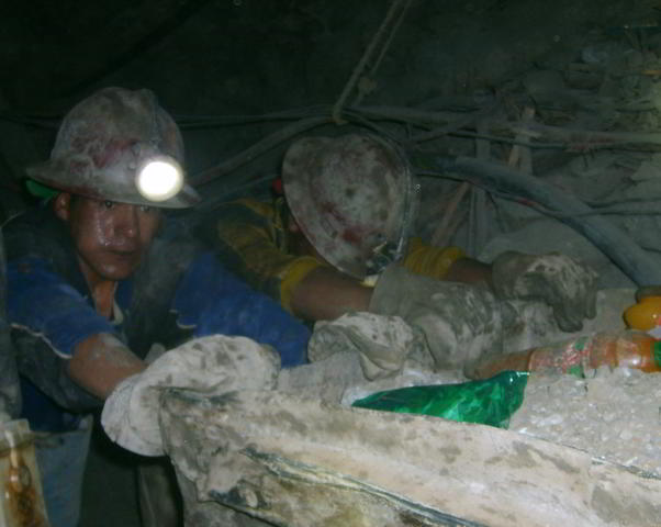 Arbeiter schieben eine Lore - man sieht deutlich die Kokakugel in der Wange