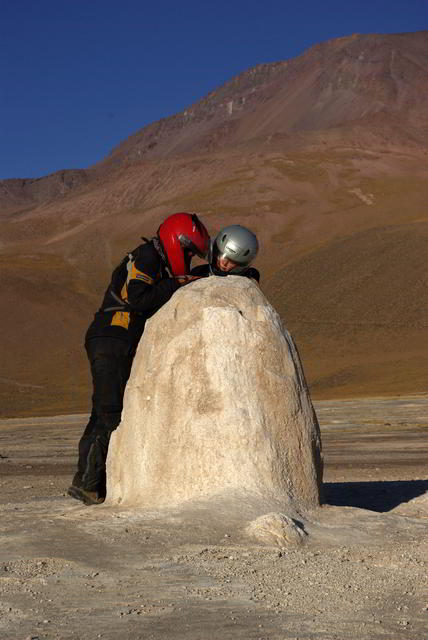 Geysirforscher in voller Schutzkleidung